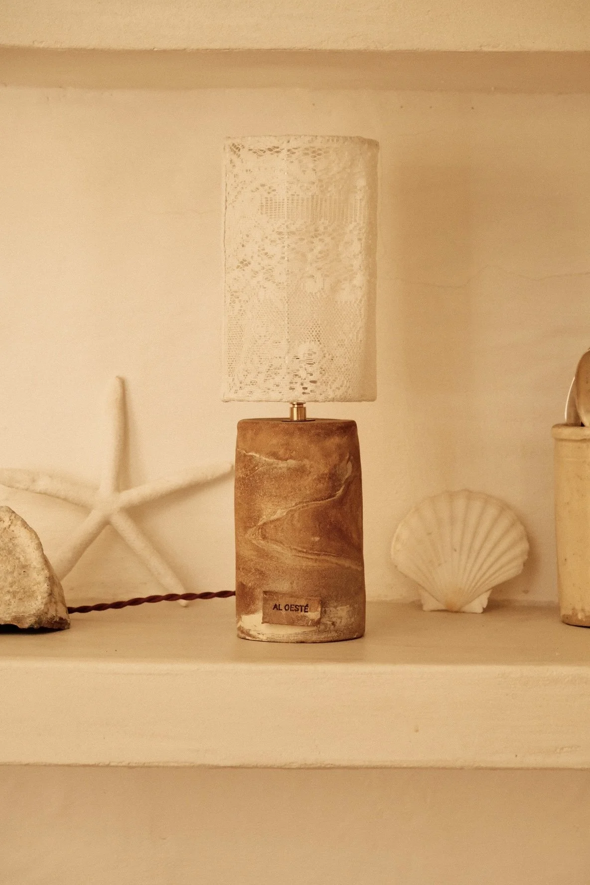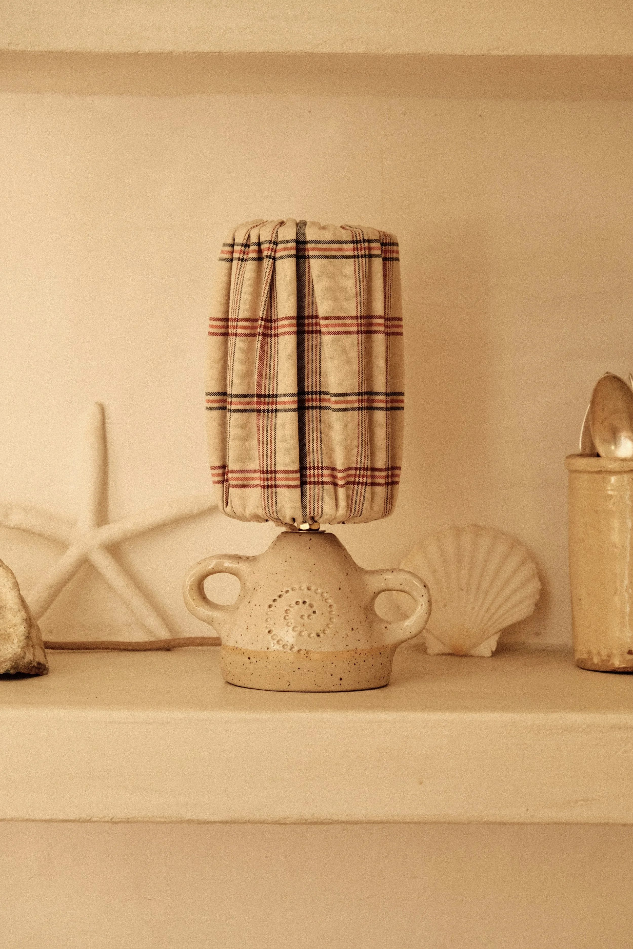 Chaque luminaire est pensé comme une œuvre unique : façonné en céramique et habillé de textile naturel ou de raphia, entièrement à la main.