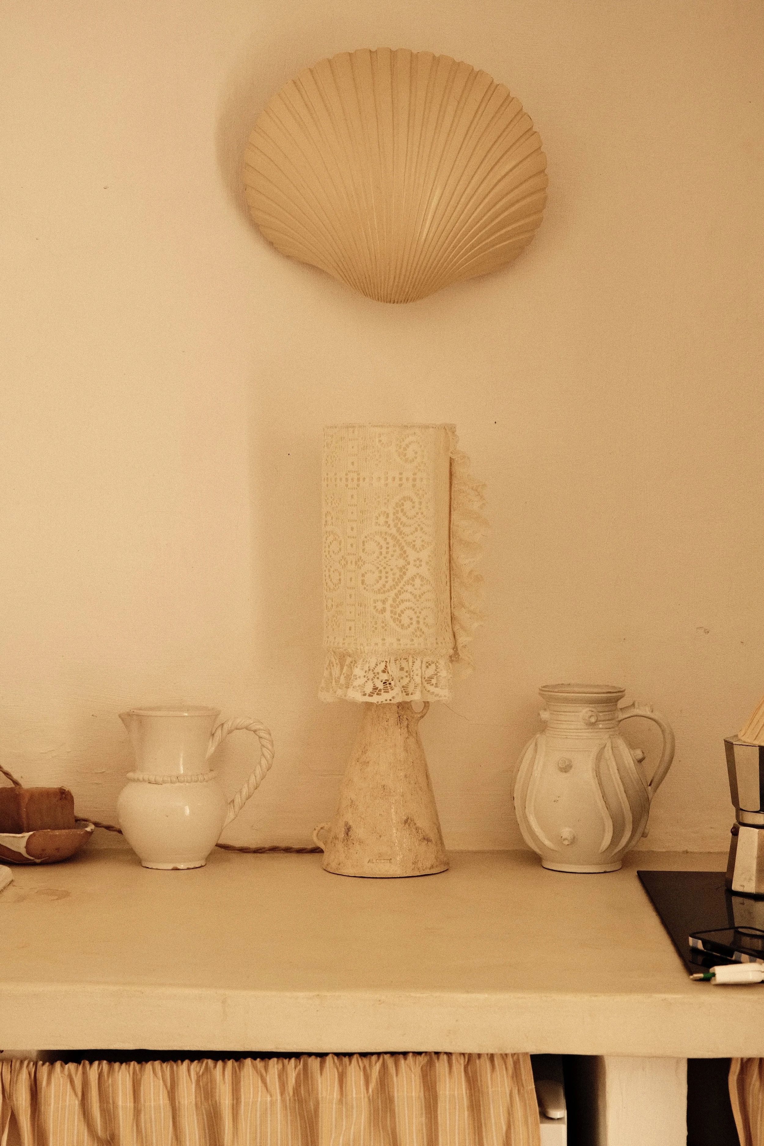 L’abat-jour est habillé d’une dentelle blanche, chinée dans une brocante à Marseille. La texture ajourée de la dentelle permet à la lumière de se diffuser en douceur, pour une ambiance feutrée.