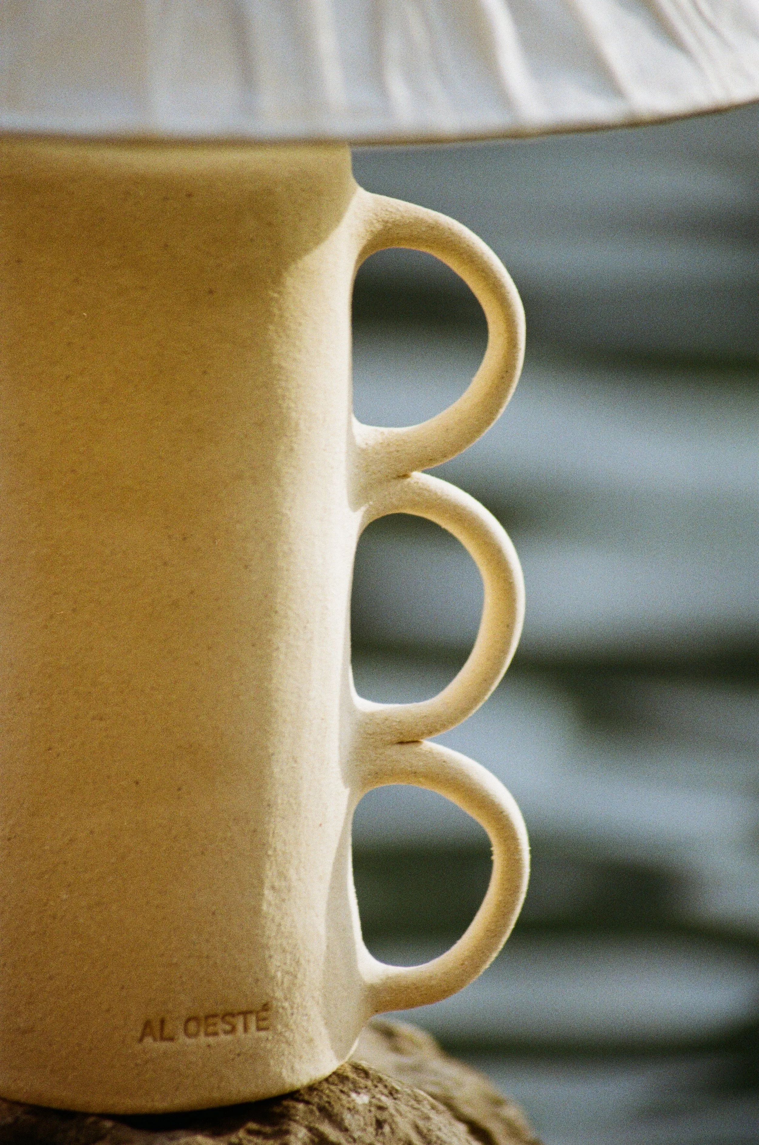 Le pied est façonné en terre blanche chamottée, dont la texture granuleuse est volontairement préservée.